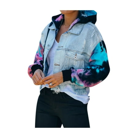 Womens Tie Dye Denim Jacket Hooded Long Sleeve Biker Coat Jeans Outerwear Walmart Canada